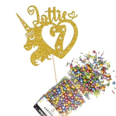 Cakeshop Cake Decoration Pack Unicorn Heart Premium Double Sided Glitter Card Topper Sign & 25g Party of Sugar Sprinkles Custom Name Age Decorations (Gold)