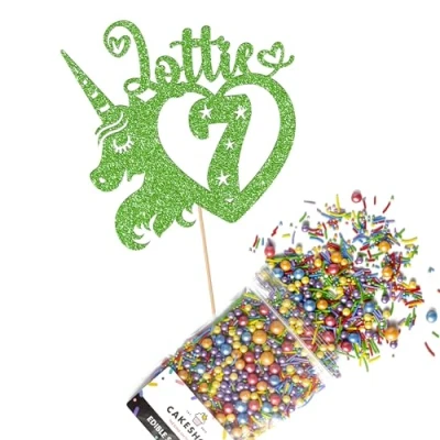 Cakeshop Cake Decoration Pack Unicorn Heart Premium Double Sided Glitter Card Topper Sign & 25g Party of Sugar Sprinkles Custom Name Age Decorations (Green)
