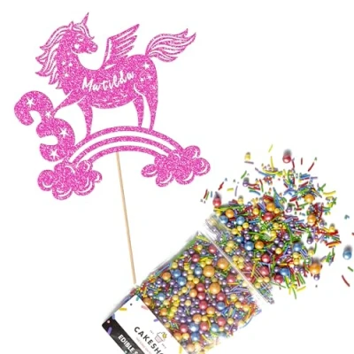 Cakeshop Cake Decoration Pack Unicorn Rainbow Premium Double Sided Glitter Card Topper Sign & 25g Party of Sugar Sprinkles Custom Name Age Decorations (Baby Pink)