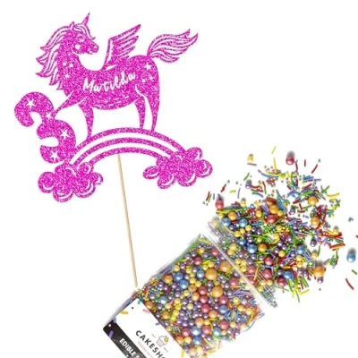 Cakeshop Cake Decoration Pack Unicorn Rainbow Premium Double Sided Glitter Card Topper Sign & 25g Party of Sugar Sprinkles Custom Name Age Decorations (Bright Pink)