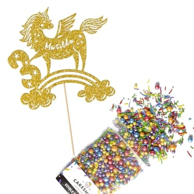 Cakeshop Cake Decoration Pack Unicorn Rainbow Premium Double Sided Glitter Card Topper Sign & 25g Party of Sugar Sprinkles Custom Name Age Decorations (Gold)