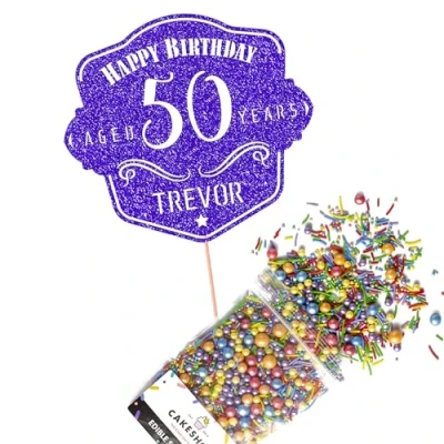 This Cakeshop Cake Decorating Pack includes 1 x 480gsm Double Sided Glitter Card Topper & 25g Cake Sprinkles (option to upgrade to 50g while customising) - perfect for your party or celebration! Cakeshop Sprinkles are Vegan, Gluten Free, Lactose free and Nut Free, all while looking amazing in striking colours and an assortment of sizes for a truly 'premium' finish Size: Sprinkles pack (perfect for a large cake) 25g, you can also upgrade to a 50g pack when customising your topper | Glitter Topper Approx 152mm (6") x 175mm (7") Toppers make a great keepsake to remember this special occasion forever, often our customers will remove the support sick and use on bedroom doors (until their next birthday!) Cakeshop Glitter Toppers are made from 480gsm premium double sided glitter card, select which colour topper you'd like then click 'Customise' to add your text personalisation and choose your sprinkles Choose from either Metallic or Rainbow sprinkles and upgrade to 50g packs in the 'Customise' section, so that you can match your sprinkles to your theme (or save them for next time!) All 'Cakeshop Cake Decorating Packs' come beautifully packed with simple to understand instructions so that you can quickly turn any cake, home made or shop bought (we wont tell!) into the perfect cake After you have added your custom information in the 'Customise Now' section our designers hand make your topper in the same font, style and topper colour as the design you've selected Cakeshop have been making the highest quality Cake Decorations since 2011 - we have thousands of design options available in our store for every occasion and theme (click 'visit the cakeshop store' above) It should go without saying - but Glitter Card toppers are flamable! We therefore recommend using only Acrylic toppers alongside candles for safety