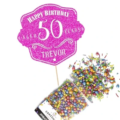 This Cakeshop Cake Decorating Pack includes 1 x 480gsm Double Sided Glitter Card Topper & 25g Cake Sprinkles (option to upgrade to 50g while customising) - perfect for your party or celebration! Cakeshop Sprinkles are Vegan, Gluten Free, Lactose free and Nut Free, all while looking amazing in striking colours and an assortment of sizes for a truly 'premium' finish Size: Sprinkles pack (perfect for a large cake) 25g, you can also upgrade to a 50g pack when customising your topper | Glitter Topper Approx 152mm (6") x 175mm (7") Toppers make a great keepsake to remember this special occasion forever, often our customers will remove the support sick and use on bedroom doors (until their next birthday!) Cakeshop Glitter Toppers are made from 480gsm premium double sided glitter card, select which colour topper you'd like then click 'Customise' to add your text personalisation and choose your sprinkles Choose from either Metallic or Rainbow sprinkles and upgrade to 50g packs in the 'Customise' section, so that you can match your sprinkles to your theme (or save them for next time!) All 'Cakeshop Cake Decorating Packs' come beautifully packed with simple to understand instructions so that you can quickly turn any cake, home made or shop bought (we wont tell!) into the perfect cake After you have added your custom information in the 'Customise Now' section our designers hand make your topper in the same font, style and topper colour as the design you've selected Cakeshop have been making the highest quality Cake Decorations since 2011 - we have thousands of design options available in our store for every occasion and theme (click 'visit the cakeshop store' above) It should go without saying - but Glitter Card toppers are flamable! We therefore recommend using only Acrylic toppers alongside candles for safety