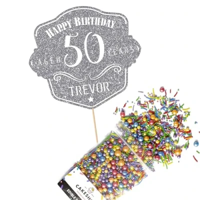This Cakeshop Cake Decorating Pack includes 1 x 480gsm Double Sided Glitter Card Topper & 25g Cake Sprinkles (option to upgrade to 50g while customising) - perfect for your party or celebration! Cakeshop Sprinkles are Vegan, Gluten Free, Lactose free and Nut Free, all while looking amazing in striking colours and an assortment of sizes for a truly 'premium' finish Size: Sprinkles pack (perfect for a large cake) 25g, you can also upgrade to a 50g pack when customising your topper | Glitter Topper Approx 152mm (6") x 175mm (7") Toppers make a great keepsake to remember this special occasion forever, often our customers will remove the support sick and use on bedroom doors (until their next birthday!) Cakeshop Glitter Toppers are made from 480gsm premium double sided glitter card, select which colour topper you'd like then click 'Customise' to add your text personalisation and choose your sprinkles Choose from either Metallic or Rainbow sprinkles and upgrade to 50g packs in the 'Customise' section, so that you can match your sprinkles to your theme (or save them for next time!) All 'Cakeshop Cake Decorating Packs' come beautifully packed with simple to understand instructions so that you can quickly turn any cake, home made or shop bought (we wont tell!) into the perfect cake After you have added your custom information in the 'Customise Now' section our designers hand make your topper in the same font, style and topper colour as the design you've selected Cakeshop have been making the highest quality Cake Decorations since 2011 - we have thousands of design options available in our store for every occasion and theme (click 'visit the cakeshop store' above) It should go without saying - but Glitter Card toppers are flamable! We therefore recommend using only Acrylic toppers alongside candles for safety