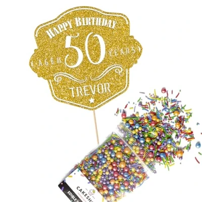 This Cakeshop Cake Decorating Pack includes 1 x 480gsm Double Sided Glitter Card Topper & 25g Cake Sprinkles (option to upgrade to 50g while customising) - perfect for your party or celebration! Cakeshop Sprinkles are Vegan, Gluten Free, Lactose free and Nut Free, all while looking amazing in striking colours and an assortment of sizes for a truly 'premium' finish Size: Sprinkles pack (perfect for a large cake) 25g, you can also upgrade to a 50g pack when customising your topper | Glitter Topper Approx 152mm (6") x 175mm (7") Toppers make a great keepsake to remember this special occasion forever, often our customers will remove the support sick and use on bedroom doors (until their next birthday!) Cakeshop Glitter Toppers are made from 480gsm premium double sided glitter card, select which colour topper you'd like then click 'Customise' to add your text personalisation and choose your sprinkles Choose from either Metallic or Rainbow sprinkles and upgrade to 50g packs in the 'Customise' section, so that you can match your sprinkles to your theme (or save them for next time!) All 'Cakeshop Cake Decorating Packs' come beautifully packed with simple to understand instructions so that you can quickly turn any cake, home made or shop bought (we wont tell!) into the perfect cake After you have added your custom information in the 'Customise Now' section our designers hand make your topper in the same font, style and topper colour as the design you've selected Cakeshop have been making the highest quality Cake Decorations since 2011 - we have thousands of design options available in our store for every occasion and theme (click 'visit the cakeshop store' above) It should go without saying - but Glitter Card toppers are flamable! We therefore recommend using only Acrylic toppers alongside candles for safety
