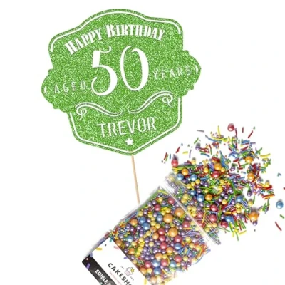 Cakeshop Cake Decoration Pack Whiskey Happy Birthday Premium Double Sided Glitter Card Topper & 25g Party of Sugar Sprinkles Custom Name Age Decorations (Green)