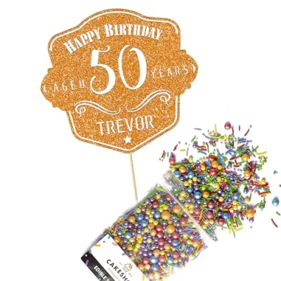 This Cakeshop Cake Decorating Pack includes 1 x 480gsm Double Sided Glitter Card Topper & 25g Cake Sprinkles (option to upgrade to 50g while customising) - perfect for your party or celebration! Cakeshop Sprinkles are Vegan, Gluten Free, Lactose free and Nut Free, all while looking amazing in striking colours and an assortment of sizes for a truly 'premium' finish Size: Sprinkles pack (perfect for a large cake) 25g, you can also upgrade to a 50g pack when customising your topper | Glitter Topper Approx 152mm (6") x 175mm (7") Toppers make a great keepsake to remember this special occasion forever, often our customers will remove the support sick and use on bedroom doors (until their next birthday!) Cakeshop Glitter Toppers are made from 480gsm premium double sided glitter card, select which colour topper you'd like then click 'Customise' to add your text personalisation and choose your sprinkles Choose from either Metallic or Rainbow sprinkles and upgrade to 50g packs in the 'Customise' section, so that you can match your sprinkles to your theme (or save them for next time!) All 'Cakeshop Cake Decorating Packs' come beautifully packed with simple to understand instructions so that you can quickly turn any cake, home made or shop bought (we wont tell!) into the perfect cake After you have added your custom information in the 'Customise Now' section our designers hand make your topper in the same font, style and topper colour as the design you've selected Cakeshop have been making the highest quality Cake Decorations since 2011 - we have thousands of design options available in our store for every occasion and theme (click 'visit the cakeshop store' above) It should go without saying - but Glitter Card toppers are flamable! We therefore recommend using only Acrylic toppers alongside candles for safety