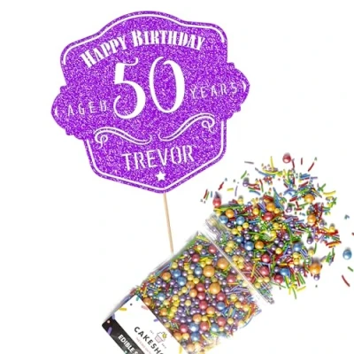 Cakeshop Cake Decoration Pack Whiskey Happy Birthday Premium Double Sided Glitter Card Topper & 25g Party of Sugar Sprinkles Custom Name Age Decorations (Purple)