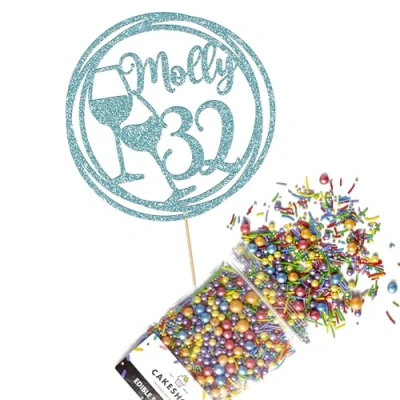 Cakeshop Cake Decoration Pack Wine Happy Birthday Premium Double Sided Glitter Card Topper & 25g Party of Sugar Sprinkles Custom Name Age Decorations (Baby Blue)