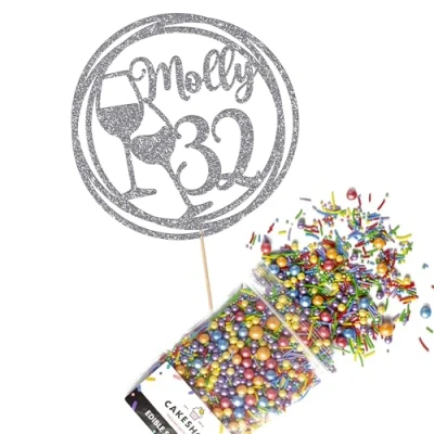 Cakeshop Cake Decoration Pack Wine Happy Birthday Premium Double Sided Glitter Card Topper & 25g Party of Sugar Sprinkles Custom Name Age Decorations (Dark Silver)