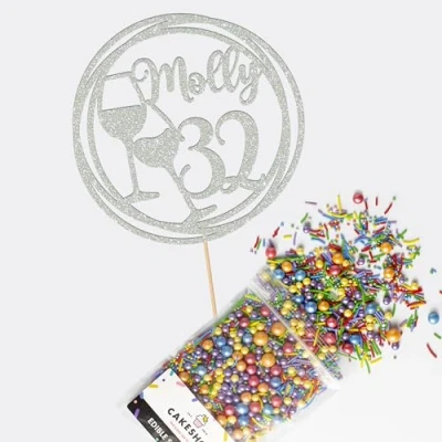 Cakeshop Cake Decoration Pack Wine Happy Birthday Premium Double Sided Glitter Card Topper & 25g Party of Sugar Sprinkles Custom Name Age Decorations (Light Silver)