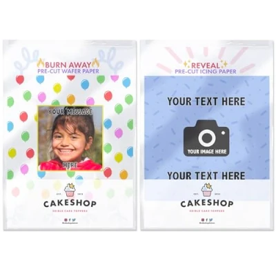 Be bang on trend and create your Cakeshop personalised edible Burn Away Cake Topper pack today! Topper pack includes 1 x PRE CUT Wafer Topper (burn away layer) and 1 x PRE CUT Icing Topper (reveal layer) Click 'Customise Now' to select from a range of topper sizes and to personalise with your custom text and images The wafer topper is applied on top and this is the layer that is burned to reveal the icing topper underneath Cakeshop Edible Toppers are Vegan, Gluten Free, Lactose free and Nut Free, plus they look amazing Our Toppers come well packed with simple to understand instructions so that you can quickly turn any cake, home made or shop bought (we wont tell!) into the perfect cake Cakeshop have been making the highest quality Cake Decorations since 2011 - we have thousands of design options available in our store for every occasion and theme (click 'visit the cakeshop store' above) Burn Cakes involve fire, so caution and adult supervision is advised at all times. The flames are weak, equal to a candle or sparkler, but the effect is dramatic as shown in our video