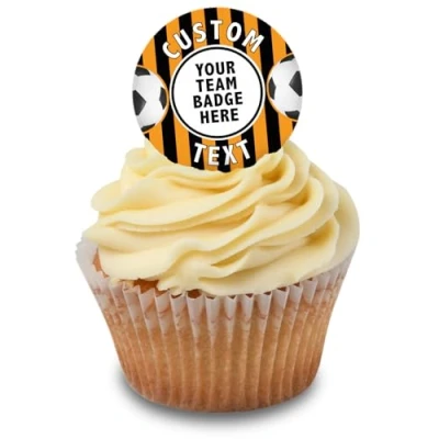 Cakeshop Cupcake Personalised Edible Cake Toppers With Black & Orange Stripe Football Border Personalise Your Custom Image Name For Birthdays Celebrations Icing Wafer Paper Options