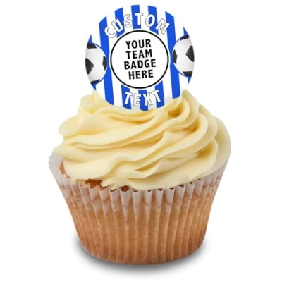 Cakeshop Cupcake Personalised Edible Cake Toppers With Blue & White Stripe Football Border Personalise Your Custom Image Name For Birthdays Celebrations Icing Wafer Paper Options