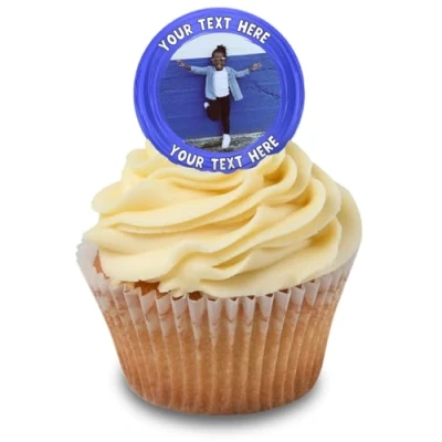 Cakeshop Cupcake Personalised Edible Cake Toppers With Dark Blue Border & Text Personalise Custom Image For Birthdays Celebrations Icing Wafer Paper Options