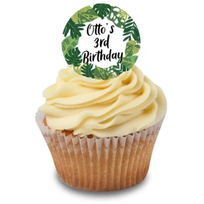 Cakeshop Cupcake Personalised Edible Cake Toppers With Jungle Leaves Border Personalise Your Custom Name & Age For Birthdays Celebrations Icing Wafer Paper Options