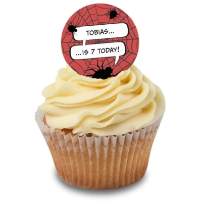 Cakeshop Cupcake Personalised Edible Cake Toppers With Red Background & Spider Webs Personalise Your Custom Name Age For Birthdays Celebrations Icing Wafer Paper Options