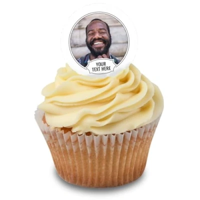 Cakeshop Cupcake Personalised Edible Cake Toppers With White Border & Text Banner Personalise Custom Image For Birthdays Celebrations Icing Wafer Paper Options