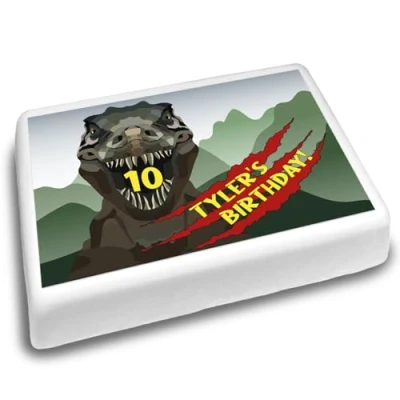 Cakeshop Landscape Personalised Edible Cake Topper With Scary T Rex & Scratches Personalise Custom Name Age For Birthdays Celebrations Multiple Shapes Sizes Icing Wafer Paper Options