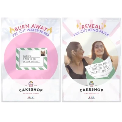 Be bang on trend and create your Cakeshop personalised edible Burn Away Cake Topper pack today! Topper pack includes 1 x PRE CUT Wafer Topper (burn away layer) and 1 x PRE CUT Icing Topper (reveal layer) Click 'Customise Now' to select from a range of topper sizes and to personalise with your custom text and image The wafer topper is applied on top and this is the layer that is burned to reveal the icing topper underneath Cakeshop Edible Toppers are Vegan, Gluten Free, Lactose free and Nut Free, plus they look amazing Our Toppers come well packed with simple to understand instructions so that you can quickly turn any cake, home made or shop bought (we wont tell!) into the perfect cake Cakeshop have been making the highest quality Cake Decorations since 2011 - we have thousands of design options available in our store for every occasion and theme (click 'visit the cakeshop store' above) Burn Cakes involve fire, so caution and adult supervision is advised at all times. The flames are weak, equal to a candle or sparkler, but the effect is dramatic as shown in our video