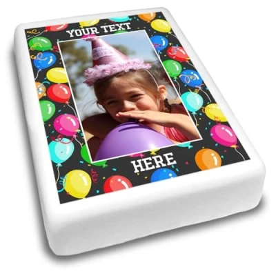 Cakeshop Portrait Personalised Edible Cake Topper With Balloon Border & Text Custom Image For Birthdays Celebrations Multiple Shapes Sizes Icing Wafer Paper Options
