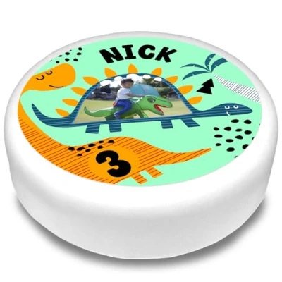 Cakeshop Round Personalised Edible Cake Topper With Cute Blue & Orange Dinosaur Personalise Custom Image Text For Birthdays Celebrations Multiple Shapes Sizes Icing Wafer Paper Options
