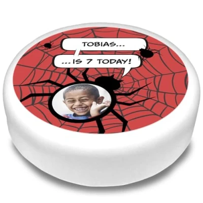 Cakeshop Round Personalised Edible Cake Topper With Red Background & Spider Webs Personalise Custom Name Age For Birthdays Celebrations Multiple Shapes Sizes Icing Wafer Paper Options