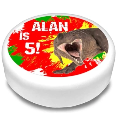 Cakeshop Round Personalised Edible Cake Topper With Red Background & T Rex Personalise Custom Name Age For Birthdays Celebrations Multiple Shapes Sizes Icing Wafer Paper Options
