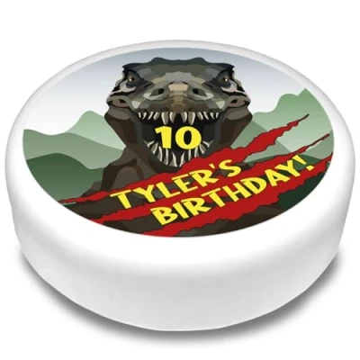 Cakeshop Round Personalised Edible Cake Topper With Scary T Rex & Scratches Personalise Custom Name Age For Birthdays Celebrations Multiple Shapes Sizes Icing Wafer Paper Options