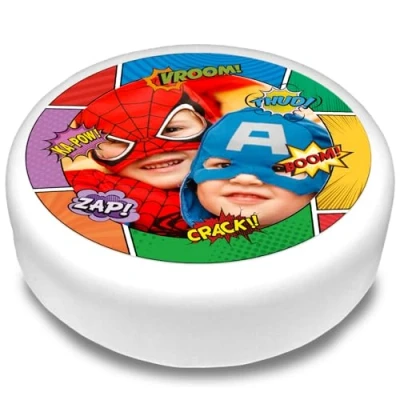 Cakeshop Round Personalised Edible Cake Topper With Superhero Comic Strip Border Personalise Custom Image For Birthdays & Celebrations Multiple Shapes Sizes Icing Wafer Paper Options