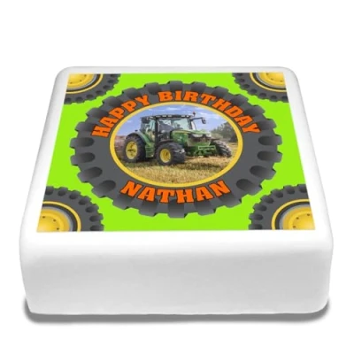 Cakeshop Square Personalised Edible Cake Topper Farm Tractor Tyre Wheel Border Custom Text or Name For Birthdays & Celebrations Multiple Shapes Sizes Icing Wafer Paper Options