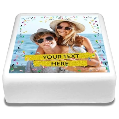 Cakeshop Square Personalised Edible Cake Topper With Confetti Border & Gold Text Banners Custom Image For Birthdays Celebrations Multiple Shapes Sizes Icing Wafer Paper Options