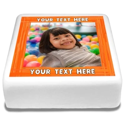Cakeshop Square Personalised Edible Cake Topper With Orange Border & Text Custom Image For Birthdays Celebrations Multiple Shapes Sizes Icing Wafer Paper Options