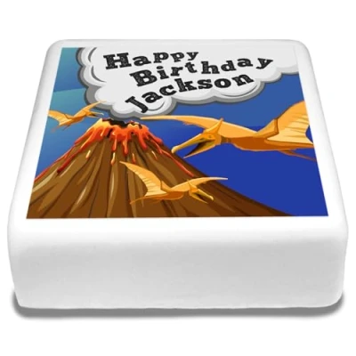 Cakeshop Square Personalised Edible Cake Topper With Volcano & Dinosaurs Personalise Custom Name For Birthdays Celebrations Multiple Shapes Sizes Icing Wafer Paper Options