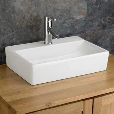 This Calabria White Ceramic Large Rectangular Basin measures 510mm in width and 360mm in depth. It's a stunning and spacious family-sized countertop basin. It fits effortlessly on most counters and vanity units or can be wall-hung with the correct fixings provided. Ample room on either side of the tap accommodates all your bathroom essentials. Crafted from durable gloss ceramic, the Calabria basin ensures years of reliable use. It's incredibly easy to install and includes one tap hole. The sleek design and white finish add a touch of elegance to any bathroom decor. It offers a pleasing combination of functionality, durability, and style. Designed for use with non-slotted wastes. Wall fixings included.. Calabria 510mm x 370mm White Ceramic Large Rectangular Bathroom Basin Clickbasin