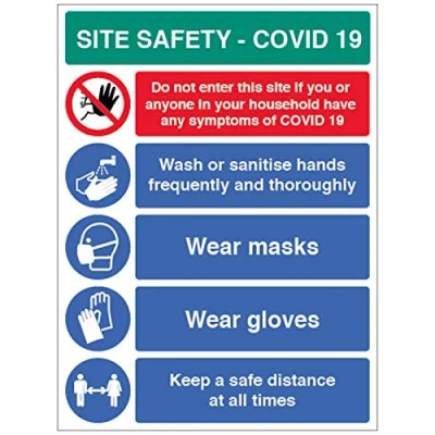 Caledonia Signs 18278Q Site Safety COVID19 wash hands, wear masks, gloves, keep a safe distance Semi Rigid PVC sign (450x600mm)