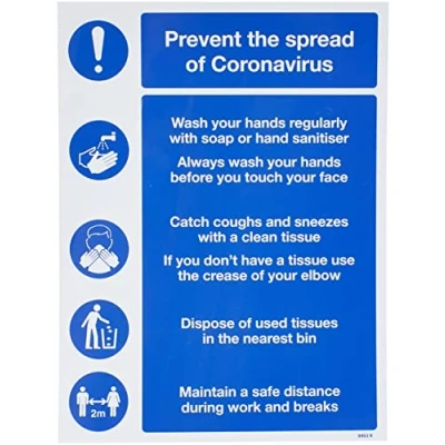 Safety sign to help display and advise of steps to take to mininmise the impact of coronavirus. Use as part of your workplace control measures during the COVID19 outbreak High quality print on glossy white, rigid PVC Waterproof - suitable for indoor and outdoor locations Lightweight with high impact strength, easily drilled for fixing Self-extinguishing material prevents the ignition of flames & flame spread