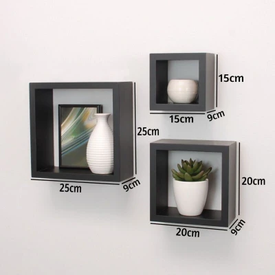ManoManoGeneral description Welcome to the Gillhk Cali Wall Floating Cube Box Shelf Set of 3. This stunning set of floating shelves is designed to enhance your home decor while providing functional storage solutions. Technical specifications Brand: Spot On Dealz Set of 3 cube shelves Sizes: SMALL: 15CM x 9CM x 15CM, MEDIUM: 20CM x 9CM x 20CM, LARGE: 25CM x 9CM x 25CM Colors: Black, White, Oak, Grey Material: MDF Wood Item Weight: 2 KG Installation Simple to mount onto the wall Fixing and instruction included Usage Perfect for placing images, pictures, and other ornaments Features a clean contemporary style with no visible brackets