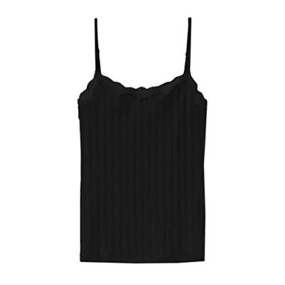 Spaghetti top with swiss+cotton seal of approval Elegant pinstripe look thanks to fine needle pull Perfect for combining with outerwear Long colour brilliance Delicate lace and decorative bows on the neckline