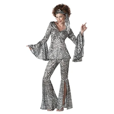 Costume Includes: Shirt with flared sleeves, Pants with Bellbottoms, Headband Women's X-Large (12 -14): Chest 42″, Waist 33″, Hips 43″ Size Women's XL (12-14): Chest 42" Waist 33" Hips 43" Height 68 Up to 170 Lbs Pullover top has V-neck, bustline ruching and wide bell sleeves below elbows 100% polyester interlock knit has black and white swirl print w/ iridescent sequins.Pullover top has V-neck and wide bell sleeves below elbows.Pants have elastic waist, wide slit flares from knee to ankle, Manufacturer: California Costumes