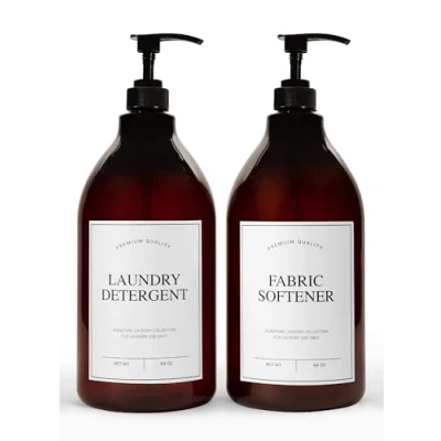 Calindiana Modern Farmhouse Liquid Laundry Detergent and Fabric Softener Dispenser for Room Decor Organization, PET Plastic Landry Soap Containers with Water Resistant Labels, Amber 64oz