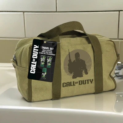 COMPLETE GIFT SET: Official Call of Duty men's travel set featuring a military-style wash bag, 100ml body wash, 100ml shampoo, and 50ml roll-on deodorant MILITARY-INSPIRED DESIGN: Durable khaki canvas wash bag with Call of Duty branding and camouflage-themed toiletry products for gaming enthusiasts TRAVEL-FRIENDLY: Perfectly sized toiletries that comply with travel regulations, packed in a sturdy carry bag with convenient handle for on-the-go use GAMING MERCHANDISE: Authentic licensed Call of Duty products make this an ideal gift for fans of the popular video game franchise PRACTICAL ESSENTIALS: Contains everything needed for daily grooming, including HEAD shampoo for hair care, BODY wash for cleansing, and GO roll-on deodorant for freshness