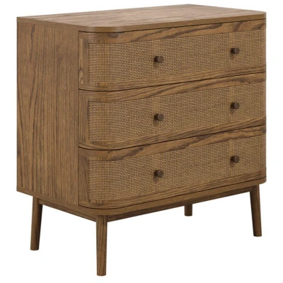 The Callie chest of drawers features a smoked wooden frame with a weave front, offering three spacious drawers that combine style and functionality. Features: Curved Edges On The Drawers Wooden Frame 3 Drawer Chest Smoked Colour Drawer Stoppers Care/Maintenance: Clean damp cloth or duster 30% Recycled?: No Trend: Modern Country Primary Colour: Smoked Secondary Colour: Smoked Primary Material: Wood Variant Secondary Material: Weave Primary Finish: Matte Secondary Finish: Matte Dimensions & Weight: Dimensions:L45 x W80 x H80 cm Weight: 30 kg . Callie Chest - Wood Variant/Weave - Smoked/Smoked - Partially Assembled . Delivery is FREE to UK mainland excluding the following postcodes, where a surcharge may apply. AB, DD, HS, IV, KW1-14, KY, PA1-19, PA20+, PH, W1, NW1, WC1, WC2, EC1, EC2, EC3, EC4, E1, SE1, SE11.. 3#5