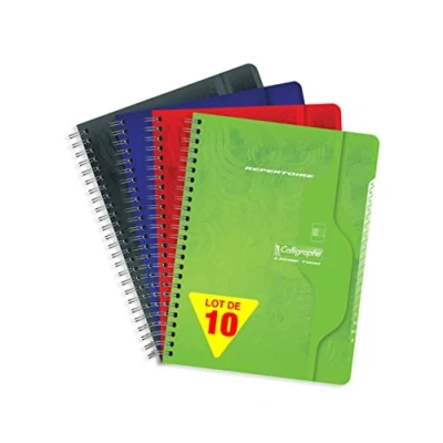 SET OF 10 INDEX BOOKS: ideal for school lists, schools and communities. SMALL SIZE: school size, easy to store in schoolbag COVER: varnished recycled coated card. AVAILABLE COLOURS: dark blue, red, anise green and black REINFORCED DOUBLE SPIRAL: allows full aperture, ideal for double-sided use of sheets PAPER: 70 g/m² fine vellum white, the best value for money. ALPHABETIC KEYS (A-Z): two-tone for easy identification. MADE IN FRANCE and PEFC CERTIFIED: for sustainable forest management