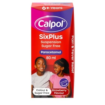 Calpol SixPlus Oral Suspension Paracetamol (1 x 80ml), Sugar Free Strawberry Flavour 6 Plus with for Fever & Pain Relief, Suitable Kids from Years
