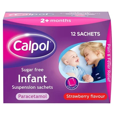JoybuyCalpol Sugar Free Infant Suspension Sachets provide sugar-free, strawberry-flavoured relief for babies and children from 2 months old, helping soothe fever, teething pain, colds, and other aches. Each convenient sachet contains 120mg paracetamol, is gentle on tummies, and easy to administer.