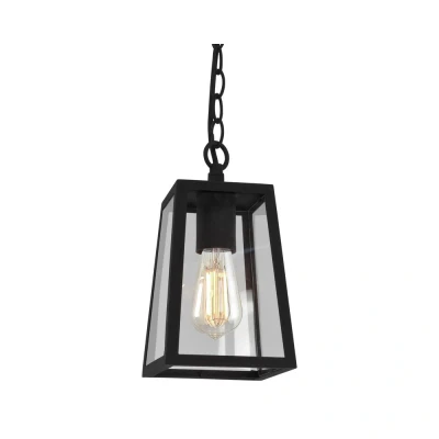The outdoor pendant lamp has a traditional look to it that will enhance and brighten your outdoor area. The single bulb is suspended from above and encased in a tapered rectangular shaped box with clear glass panes. This fitting has a black finish, there are other finish options available.
