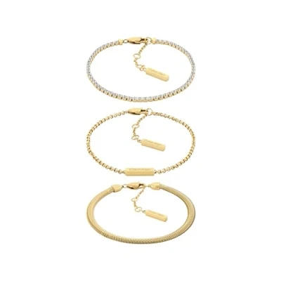 MINIMALIST STYLE WITH CRYSTAL DETAILS – This set of 3 women’s bracelets from the Calvin Klein CK TRIO collection combines clean lines, sparkling crystals, and the iconic CK logo in a refined, feminine design that elevates any outfit, whether worn together or separately PREMIUM MATERIALS AND FLAWLESS FINISH – Bracelets crafted in polished gold stainless steel with crystal inlays that elegantly catch the light, reflecting Calvin Klein’s exceptional quality and timeless design WEAR THEM TOGETHER OR INDIVIDUALLY – 17 cm inner circumference with balanced proportions for a comfortable, elegant fit, perfect for daily wear or to elevate a more sophisticated look A MODERN, TIMELESS GIFT OPTION – The Calvin Klein bracelet trio offers a versatile, stylish design, perfect for special occasions and also available in silver to suit different styles and personalities LOBSTER CLASP THAT BLENDS STYLE AND FUNCTION – The refined lobster clasp ensures a secure, effortless fit while adding a discreetly elegant finishing touch