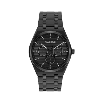 MULTIFUNCTION QUARTZ MOVEMENT – This Calvin Klein men’s watch from the CK Motion collection features a precise multifunction quartz movement with subdials for added everyday functionality and confident timekeeping. ARCHITECTURALLY SHAPED STAINLESS STEEL CASE – A 39 mm stainless steel case with a slim 8.3 mm profile, designed with clean architectural lines for a modern, masculine silhouette. BLACK DIAL WITH HORIZONTAL PATTERN – The black dial features a refined horizontal pattern with stick indexes and the Calvin Klein logo, delivering a bold, monochrome aesthetic. BLACK IP STAINLESS STEEL BRACELET – A stainless steel bracelet with black ion plating, combining brushed and polished finishes and a secure clasp for a strong, contemporary look. 3 BAR WATER RESISTANCE – Water resistant up to 3 BAR, suitable for splashes and rain but not for showering, swimming, or submersion; a modern men’s watch and a sophisticated gift idea.