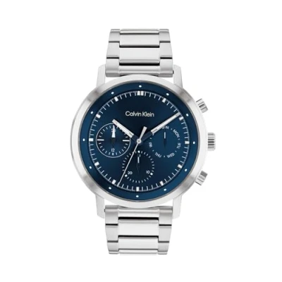 Multifunction Quartz movement with three subeyes Case thickness 10.7mm / Case Diameter 44mm Blue sunray dial Stainless steel bracelet Water Resistance: 5ATM It may be worn while showering or swimming, but not scuba diving